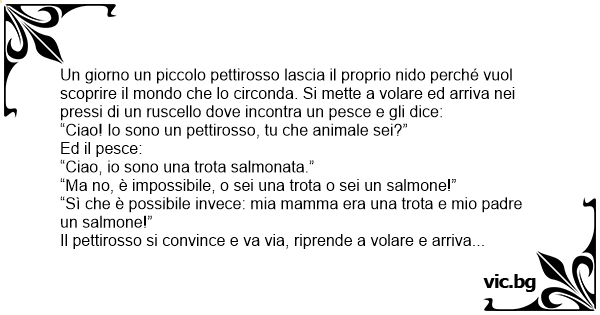 Un giorno un piccolo pettirosso lascia il proprio nido perché vuol scoprire il mondo che lo circonda. Si mette a volare ed arriva nei pressi di un ruscello dove incontra un реsсе e gli dice: