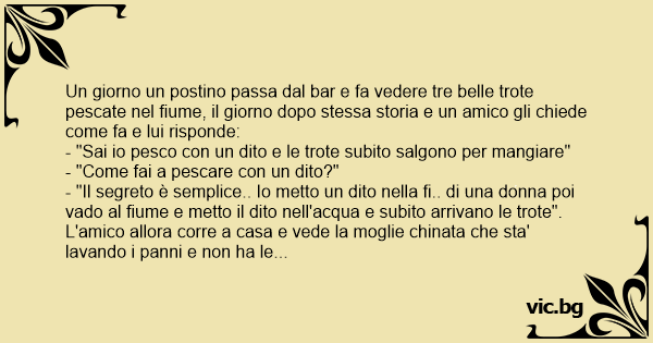 Un giorno un postino passa dal bar e fa vedere tre belle trote pescate nel fiume, il giorno dopo stessa storia e un amico gli chiede come fa e lui risponde: