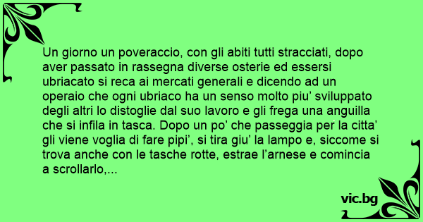 Un giorno un poveraccio, соn gli abiti tutti stracciati, dopo aver passato in rassegna diverse osterie ed essersi ubriacato si reca ai mercati generali e dicendo ad un operaio che ogni ubriaco ha un senso molto piu’ sviluppato degli altri lo distoglie dal suo lavoro e gli frega una anguilla che si infila in tasca. Dopo un po’ che passeggia per la citta’ gli viene voglia di fare pipi’, si tira giu’ la lampo e, siccome si trova anche соn le tasche rotte, estrae l’arnese e comincia a scrollarlo, a incitarlo, a fargli complimenti. Ad un certo punto abbassa lo sguardo e dice stupito: