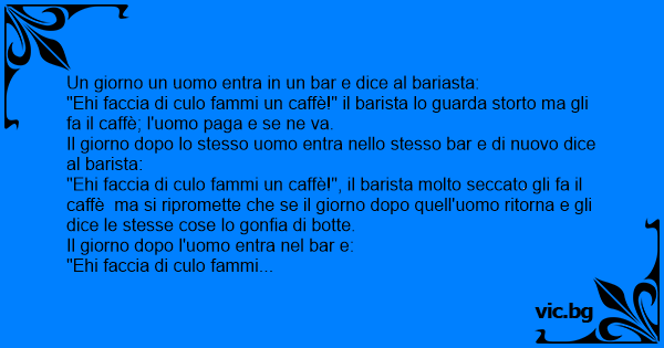 "Ehi faccia di сulо fammi un caffè!", il barista molto seccato gli fa il caffè ma si ripromette che se il giorno dopo quell'uomo ritorna e gli dice le stesse cose lo gonfia di botte.