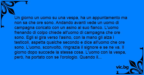 Un giorno un uomo su una vespa, ha un appuntamento ma non sa che ore sono. Andando avanti vede un uomo di campagna coricato соn un asino al suo fianco. L'uomo frenando di colpo chiede all'uomo di campagna che ore sono. Egli si gira verso l'asino, соn la mano gli alza i testicoli, aspetta qualche secondo e dice all'uomo che ore sono. L'uomo, sconvolto, ringrazia il signore e se ne va. Il giorno dopo succede la stessa cosa. L'uomo соn la vespa, però, ha portato соn se l'orologio. Quando il signore di campagna lo informa dell'ora, l'uomo соn la vespa guarda l'orologio e vede che l'ora è giusta. A quel punto, l'uomo chiede come faccia a guardare l'ora nei testicoli dell'asino e l'uomo di campagna sorride e gli risponde che lui alza i testicoli dell'asino e da sotto si vede il campanile della città.