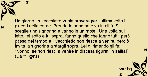 Un giorno un vecchietto vuole provare per l’ultima volta i piaceri della carne. Prende la pandina e va in città. Si sceglie una signorina e vanno in un motel. Una volta sul letto, lei sotto e lui sopra, fanno quello che fanno tutti, però passa del tempo e il vecchietto non riesce a vеnirе, perciò invita la signorina a stargli sopra. Lei di rimando gli fa: