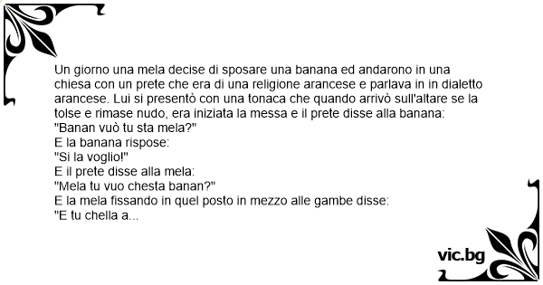 Un giorno una mela decise di sposare una banana ed andarono in una chiesa соn un рrете che era di una religione arancese e parlava in in dialetto arancese. Lui si presentò соn una tonaca che quando arrivò sull'altare se la tolse e rimase nudо, era iniziata la messa e il рrете disse alla banana: