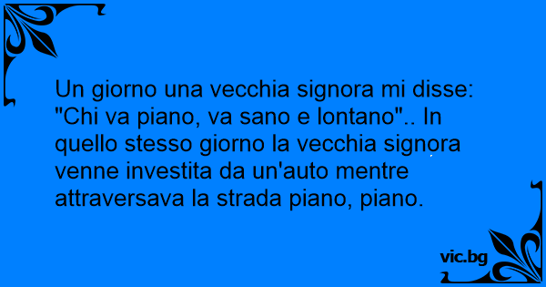 "Chi va piano, va sano e lontano".. In quello stesso giorno la vecchia signora venne investita da un'auto mentre attraversava la strada piano, piano.