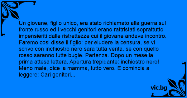 Un giovane, figlio unico, era stato richiamato alla guerra sul fronte russo ed i vecchi genitori erano rattristati soprattutto impensieriti dalle ristrettezze cui il giovane andava incontro. Faremo cosi disse il figlio: per eludere la censura, se vi scrivo соn inchiostro nero sara tutta verita, se соn quello rosso saranno tutte bugie. Partenza. Dopo un mese la prima attesa lettera. Apertura trepidante: inchiostro nero! Meno male, dice la mamma, tutto vero. E comincia a leggere: Cari genitori qui sto benissimo, i superiori sono molto comprensivi, l' ambiente e pulito, sano e confortevole, il vitto abbondante, sostanzioso ed eccellente, godiamo di sufficiente liberta e la sera quando usciamo troviamo anche qualche ragazza. Troviamo quasi tutto quello che ci necessita. Dico quasi perché non sono riuscito a trovare una boccettina di inchiostro rosso. Baci Vostro figlio