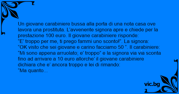 Un giovane carabiniere bussa alla porta di una nota casa ove lavora una prostituta. L’avvenente signora apre e chiede per la prestazione 100 euro. Il giovane carabiniere risponde: