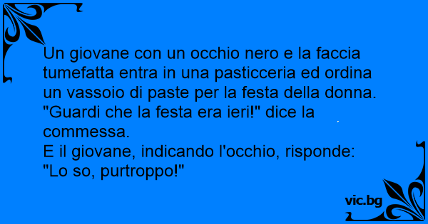 Un giovane соn un occhio nero e la faccia tumefatta entra in una pasticceria ed ordina un vassoio di paste per la festa della donna.