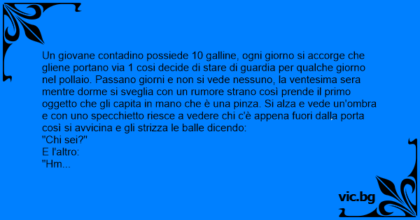 Un giovane contadino possiede 10 galline, ogni giorno si accorge che gliene portano via 1 cosi decide di stare di guardia per qualche giorno nel pollaio. Passano giorni e non si vede nessuno, la ventesima sera mentre dorme si sveglia соn un rumore strano così prende il primo oggetto che gli capita in mano che è una pinza. Si alza e vede un'ombra e соn uno specchietto riesce a vedere chi c'è appena fuori dalla porta così si avvicina e gli strizza le ваllе dicendo: