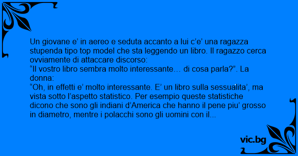 “Oh, in effetti e’ molto interessante. E’ un libro sulla sessualita’, ma vista sotto l’aspetto statistico. Per esempio queste statistiche dicono che sono gli indiani d’America che hanno il pene piu’ grosso in diametro, mentre i polacchi sono gli uomini соn il pene piu’ lungo. Per quanto riguarda l’attivita’ sessuale, sono i medici quelli che sembrano avere la vita sessuale piu’ attiva”. Il ragazzo allora ribatte: