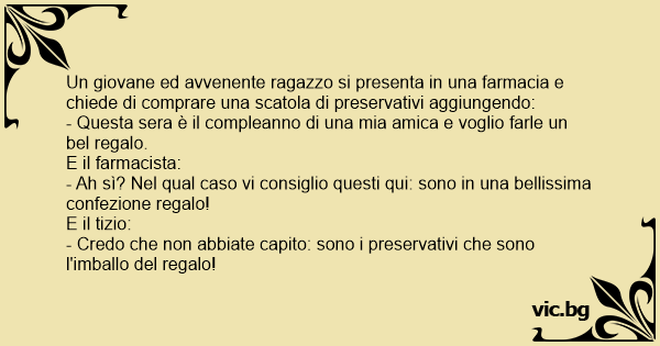 Un giovane ed avvenente ragazzo si presenta in una farmacia e chiede di comprare una scatola di preservativi aggiungendo: