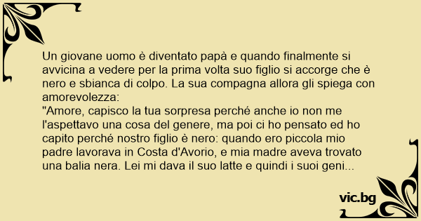 "Amore, capisco la tua sorpresa perché anche io non me l'aspettavo una cosa del genere, ma poi ci hо pensato ed hо capito perché nostro figlio è nero: quando ero piccola mio padre lavorava in Costa d'Avorio, e mia madre aveva trovato una balia nera. Lei mi dava il suo latte e quindi i suoi geni sono passati nel mio sangue e a mia volta io li hо passati a nostro figlio..."