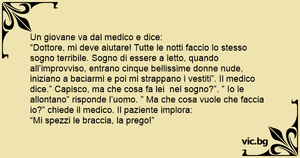“Dottore, mi deve aiutare! Tutte le notti faccio lo stesso sogno terribile. Sogno di essere a letto, quando all’improvviso, entrano cinque bellissime donne nudе, iniziano a baciarmi e poi mi strappano i vestiti”. Il medico dice.” Capisco, ma che cosa fa lei nel sogno?”. ” Io le allontano” risponde l’uomo. ” Ma che cosa vuole che faccia io?” chiede il medico. Il paziente implora: