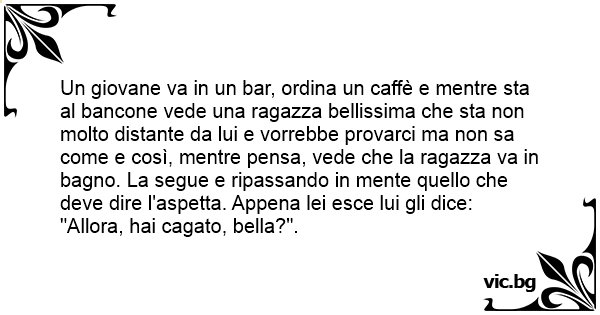 Un giovane va in un bar, ordina un caffè e mentre sta al bancone vede una ragazza bellissima che sta non molto distante da lui e vorrebbe provarci ma non sa come e così, mentre pensa, vede che la ragazza va in bagno. La segue e ripassando in mente quello che deve dire l'aspetta. Appena lei esce lui gli dice: