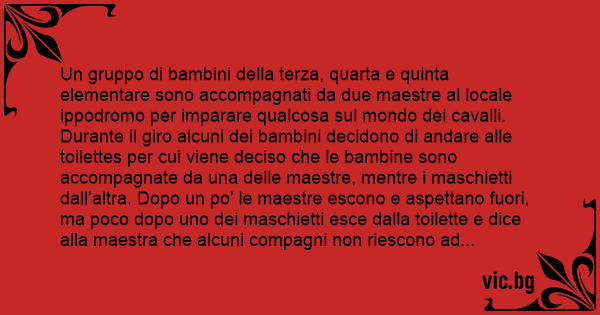 Un gruppo di bambini della terza, quarta e quinta elementare sono accompagnati da due maestre al locale ippodromo per imparare qualcosa sul mondo dei cavalli. Durante il giro alcuni dei bambini decidono di andare alle toilettes per cui viene deciso che le bambine sono accompagnate da una delle maestre, mentre i maschietti dall’altra. Dopo un po’ le maestre escono e aspettano fuori, ma poco dopo uno dei maschietti esce dalla toilette e dice alla maestra che alcuni compagni non riescono ad arrivare all’urinatorio. Non avendo altra scelta la maestra entra e comincia ad issare i piccoli ragazzini prendendoli per le braccia uno ad uno. Ma giunto all’ultimo cerca di alzarlo senza riuscirci, notando pero’ che e’ ben dotato per un ragazzino di scuola elementare. “Io credo che tu sia della quinta…” lei comincia a dire. Ma lui subito: