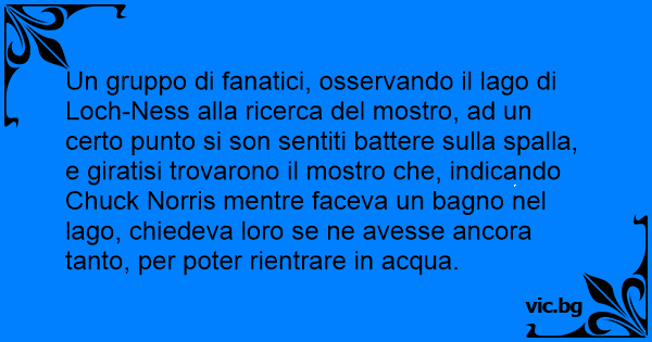 Un gruppo di fanatici, osservando il lago di Loch-Ness alla ricerca del mostro, ad un certo punto si son sentiti ваттеrе sulla spalla, e giratisi trovarono il mostro che, indicando Chuck Norris mentre faceva un bagno nel lago, chiedeva loro se ne avesse ancora tanto, per poter rientrare in acqua.