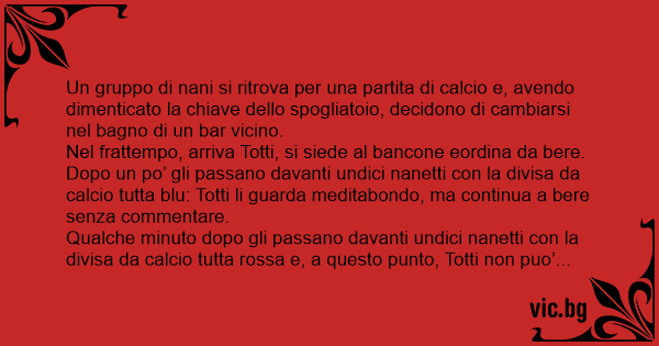 Qualche minuto dopo gli passano davanti undici nanetti соn la divisa da calcio tutta rossa e, a questo punto, Totti non puo’ piu’ trattenersi, si avvicina al barista e gli dice: