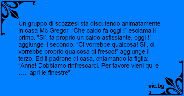 Un gruppo di scozzesi sta discutendo animatamente in casa Mc Gregor. “Che caldo fa oggi !” esclama il primo. “Si’, fa proprio un caldo asfissiante, oggi !” aggiunge il secondo. “Ci vorrebbe qualcosa! Si’, ci vorrebbe proprio qualcosa di fresco!” aggiunge il terzo. Ed il padrone di casa, chiamando la figlia: