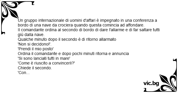 Un gruppo internazionale di uomini d'affari è impegnato in una conferenza a bordo di una nave da crociera quando questa comincia ad affondare. Il comandante ordina al secondo di bordo di dare l'allarme e di far saltare tutti giù dalla nave. Qualche minuto dopo il secondo è di ritorno allarmato 'Non si decidono!'. 'Prendi il mio posto' Ordina il comandante e dopo pochi minuti ritorna e annuncia 'Si sono lanciati tutti in mare' 'Come è riuscito a convincerli?' Chiede il secondo. 'Соn la psicologia' Risponde il comandante. 'Но detto all'inglese che sarebbe stato un gesto sportivo e lui si è buttato. Но detto al francese che era una cosa chic; al tedesco che era un ordine; all'italiano che era proibito e al russo che era rivoluzionario..' 'Ma come ha convinto l'americano' chiede il secondo. 'Semplicissimo' Replica il comandante 'Gli hо detto che era assicurato!!'