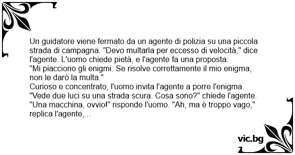 Curioso e concentrato, l'uomo invita l'agente a porre l'enigma. "Vede due luci su una strada scura. Cosa sono?" chiede l'agente. "Una macchina, ovvio!" risponde l'uomo. "Ah, ma è troppo vago," replica l'agente, "potrebbe essere una Fiat o una Mercedes. Devo multarla."