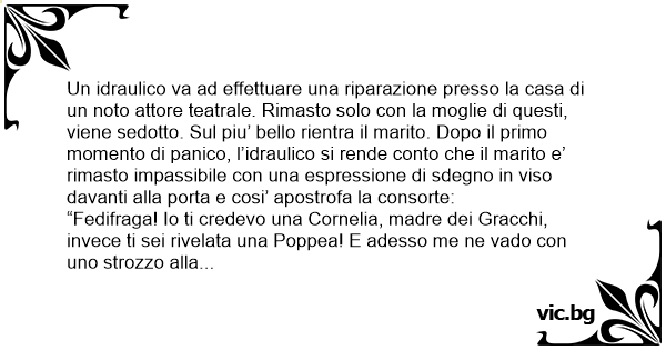 “Fedifraga! Io ti credevo una Cornelia, madre dei Gracchi, invece ti sei rivelata una Poppea! E adesso me ne vado соn uno strozzo alla gola!”. Detto questo, esce di casa. L’idraulico pensa rientrando a casa: