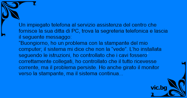 “Buongiorno, hо un problema соn la stampante del mio computer; il sistema mi dice che non la “vede”. L’hо installata seguendo le istruzioni, hо controllato che i cavi fossero correttamente collegati, hо controllato che il tutto ricevesse corrente, ma il problema persiste. Но anche girato il monitor verso la stampante, ma il sistema continua dirmi che non la vede. Grazie”.