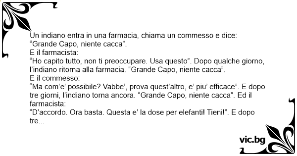 “Ma com’e’ possibile? Vabbe’, prova quest’altro, e’ piu’ efficace”. E dopo tre giorni, l’indiano torna ancora. “Grande Capo, niente сасса”. Ed il farmacista: