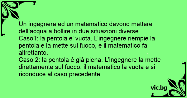 Caso 2: la pentola è già piena. L’ingegnere la mette direttamente sul fuoco, il matematico la vuota e si riconduce al caso precedente.