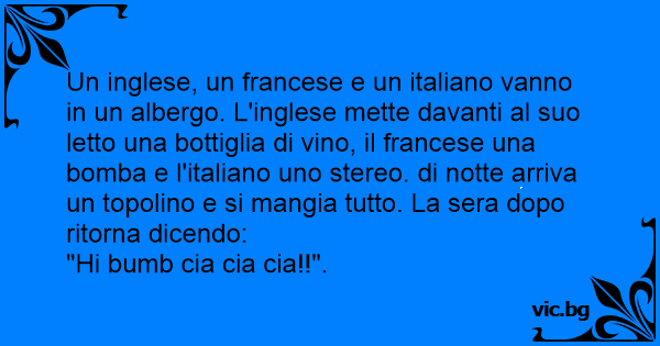 Un inglese, un francese e un italiano vanno in un albergo. L'inglese mette davanti al suo letto una bottiglia di vino, il francese una bomba e l'italiano uno stereo. di notte arriva un topolino e si mangia tutto. La sera dopo ritorna dicendo: