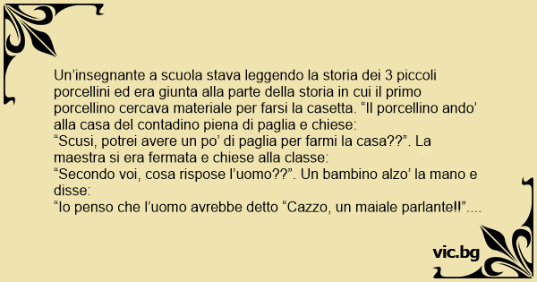 Un’insegnante a scuola stava leggendo la storia dei 3 piccoli porcellini ed era giunta alla parte della storia in cui il primo porcellino cercava materiale per farsi la casetta. “Il porcellino ando’ alla casa del contadino piena di paglia e chiese: