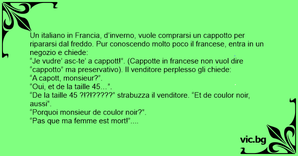 Un italiano in Francia, d’inverno, vuole comprarsi un cappotto per ripararsi dal freddo. Pur conoscendo molto poco il francese, entra in un negozio e chiede: