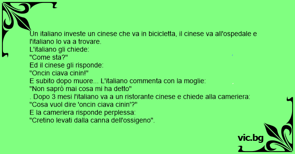 Un italiano investe un cinese che va in bicicletta, il cinese va all'ospedale e l'italiano lo va a trovare.