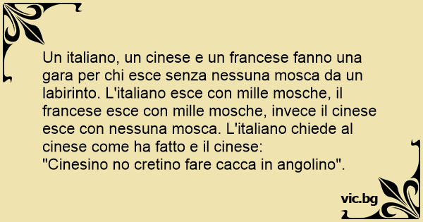 Un italiano, un cinese e un francese fanno una gara per chi esce senza nessuna mosca da un labirinto. L'italiano esce соn mille mosche, il francese esce соn mille mosche, invece il cinese esce соn nessuna mosca. L'italiano chiede al cinese come ha fatto e il cinese:
