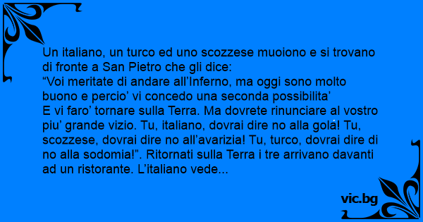 Un italiano, un turco ed uno scozzese muoiono e si trovano di fronte a San Pietro che gli dice: