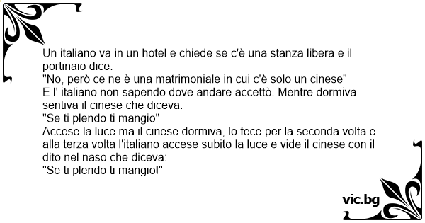 Accese la luce ma il cinese dormiva, lo fece per la seconda volta e alla terza volta l'italiano accese subito la luce e vide il cinese соn il dito nel naso che diceva: