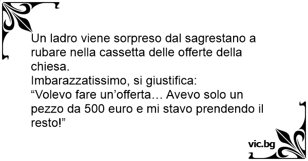 Un ladro viene sorpreso dal sagrestano a rubare nella cassetta delle offerte della chiesa.<br />Imbarazzatissimo, si giustifica:<br />“Volevo fare un’offerta… Avevo solo un pezzo da 500 euro e mi stavo prendendo il resto!”