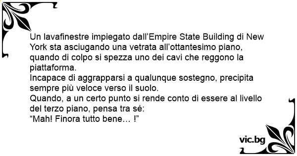 Un lavafinestre impiegato dall’Empire State Building di New York sta asciugando una vetrata all’ottantesimo piano, quando di colpo si spezza uno dei cavi che reggono la piattaforma.