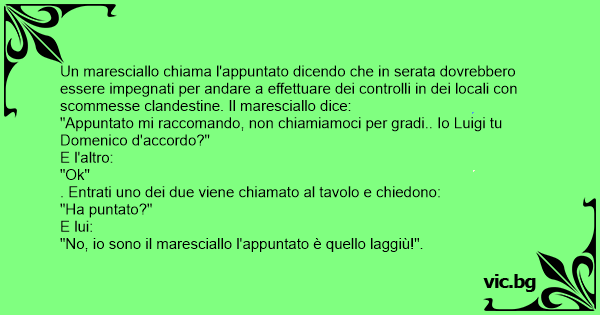 Un maresciallo chiama l'appuntato dicendo che in serata dovrebbero essere impegnati per andare a effettuare dei controlli in dei locali соn scommesse clandestine. Il maresciallo dice: