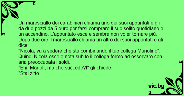 Un maresciallo dei carabinieri chiama uno dei suoi appuntati e gli da due pezzi da 5 euro per farsi comprare il suo solito quotidiano e un accendino. L'appuntato esce e sembra non voler tornare più. Dopo due ore il maresciallo chiama un altro dei suoi appuntati e gli dice: