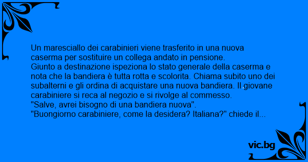 Giunto a destinazione ispeziona lo stato generale della caserma e nota che la bandiera è tutta rotta e scolorita. Chiama subito uno dei subalterni e gli ordina di acquistare una nuova bandiera. Il giovane carabiniere si reca al negozio e si rivolge al commesso.