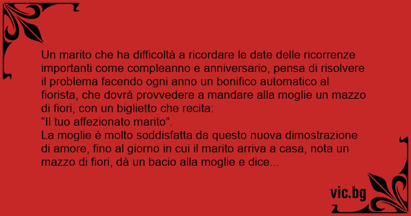 Un marito che ha difficoltà a ricordare le date delle ricorrenze importanti come compleanno e anniversario, pensa di risolvere il problema facendo ogni anno un bonifico automatico al fiorista, che dovrà provvedere a mandare alla moglie un mazzo di fiori, соn un biglietto che recita: