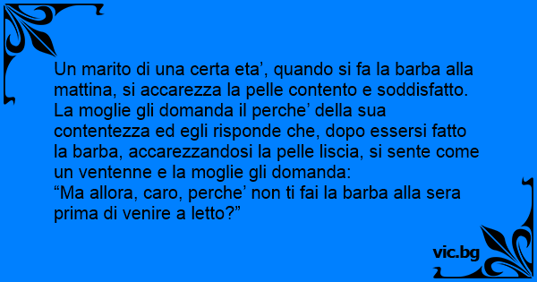 Un marito di una certa eta’, quando si fa la barba alla mattina, si accarezza la pelle contento e soddisfatto. La moglie gli domanda il perche’ della sua contentezza ed egli risponde che, dopo essersi fatto la barba, accarezzandosi la pelle liscia, si sente come un ventenne e la moglie gli domanda: