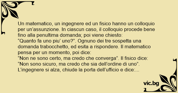 Un matematico, un ingegnere ed un fisico hanno un colloquio per un’assunzione. In ciascun caso, il colloquio procede bene fino alla penultima domanda; poi viene chiesto:
