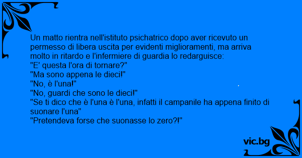 Un matto rientra nell'istituto psichatrico dopo aver ricevuto un permesso di libera uscita per evidenti miglioramenti, ma arriva molto in ritardo e l'infermiere di guardia lo redarguisce: