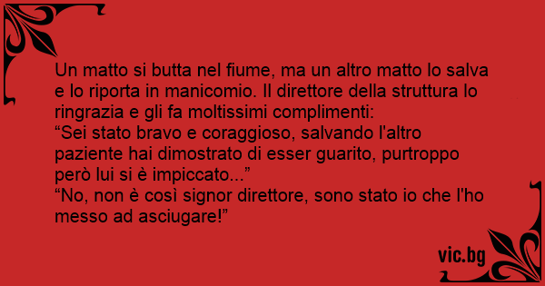 Un matto si butta nel fiume, ma un altro matto lo salva e lo riporta in manicomio. Il direttore della struttura lo ringrazia e gli fa moltissimi complimenti: