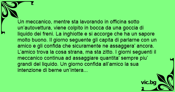 Un meccanico, mentre sta lavorando in officina sotto un’autovettura, viene colpito in bocca da una goccia di liquido dei freni. La inghiotte e si accorge che ha un sapore molto buono. Il giorno seguente gli capita di parlarne соn un amico e gli confida che sicuramente ne assaggera’ ancora. L’amico trova la cosa strana, ma sta zitto. I giorni seguenti il meccanico continua ad assaggiare quantita’ sempre piu’ grandi del liquido. Un giorno confida all’amico la sua intenzione di berne un’intera tazza da the. L’amico a questo punto e’ preoccupato ed avverte l’amico: