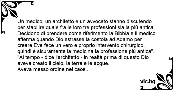 Un medico, un architetto e un avvocato si stanno confrontando su quale sia la professione più antica tra le loro 3. Il medico sostiene: "Secondo l'Antico Testamento Eva fu creata da una costola di Adamo...naturalmente per mano di un chirurgo!" L'architetto non è del tutto d'accordo e risponde:...