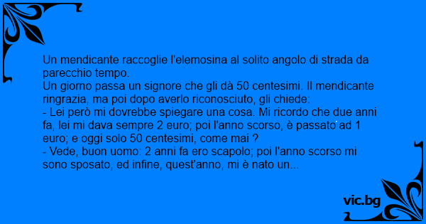 - Lei però mi dovrebbe spiegare una cosa. Mi ricordo che due anni fa, lei mi dava sempre 2 euro; poi l'anno scorso, è passato ad 1 euro; e oggi solo 50 centesimi, come mai ?