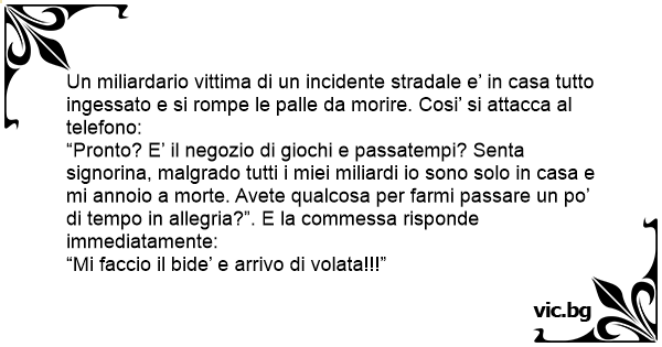 “Pronto? E’ il negozio di giochi e passatempi? Senta signorina, malgrado tutti i miei miliardi io sono solo in casa e mi annoio a morte. Avete qualcosa per farmi passare un po’ di tempo in allegria?”. E la commessa risponde immediatamente: