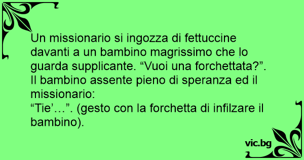 Un missionario si ingozza di fettuccine davanti a un bambino magrissimo che lo guarda supplicante. “Vuoi una forchettata?”. Il bambino assente pieno di speranza ed il missionario: