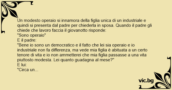 "Bene io sono un democratico e il fatto che lei sia operaio e io industriale non fa differenza, ma vede mia figlia è abituata a un certo tenore di vita e io non ammetterei che mia figlia passasse a una vita piuttosto modesta. Lei quanto guadagna al mese?"